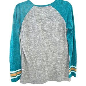 Features v neck long sleeves Heathered body arms are aqua teal dolphins logo on front sports fanatic game day football season cheer