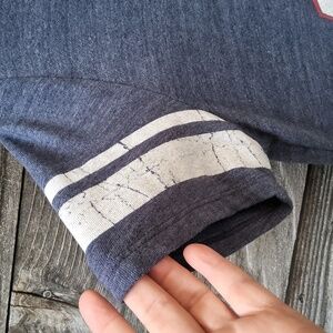 Majestic Fan Fashion t-shirt, Houston Texans #99, JJ Watt listed on the front, distressed white stripes on the short sleeves, v neck, runs smaller than size large listed , approx 26 in total length, top