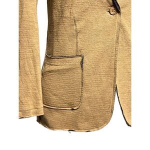 Made of 70% cotton and 30% cashmere with a cotton lining. Laying flat measures 15" from shoulder to shoulder, 18.5 pit to pit, 15.75" in the waist, 25.5" shoulder to the hem, and 21.5" sleeves. Features a raw natural edge, single button front closure, fold down collar, and front pockets.