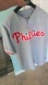 Gray baseball jersey with red Phillies by Majestic high quality jerseys some small spots or stains we did not try to clean them we are a smoke-free pet friendly home I believe this came from a smoker's home but it's a very high quality Jersey