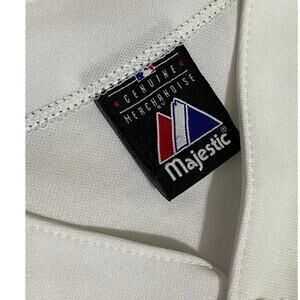 Classic Majestic white baseball jersey featuring “Indians” across the chest in bold red and navy. Black piping accents the sleeves and collar for a sharp, vintage-inspired look. Includes official Majestic branding and tagged as Medium. Button-up front, lightweight feel, and ideal for fans or collectors. Approximate measurements: 22" pit to pit x 26" length. Please refer to measurements for accurate fit.