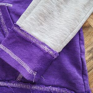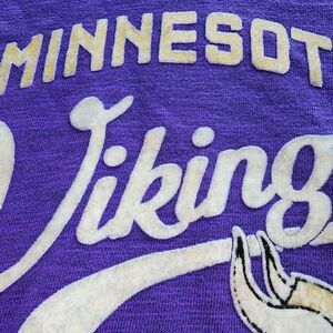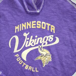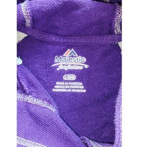 Majestic Minnesota Vikings Football Purple & Grey Hoodie Sweatshirt Size L. Excellent used condition with the exception of some stitching on the sleeve (see pictures). Very thick material with kangaroo pocket on front and rough sewn edges.