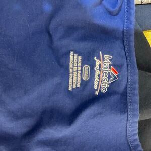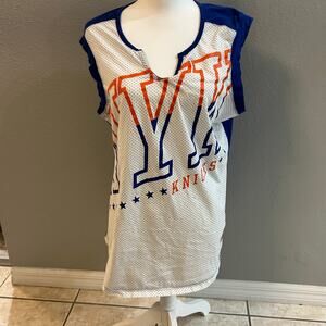 Majestic Fan Fashion New York Knicks sleeveless mesh top featuring a large NYC graphic design on the front. White breathable mesh front with a solid blue knit back, split V-neckline, and cutoff sleeves for a relaxed streetwear look. Great for Knicks fans, casual wear, layering, or basketball-inspired outfits. Gently worn with minor signs of wash/wear but no major flaws.