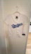 Classic white jersey with bold blue Dodgers script. Button-up front. Short sleeves.