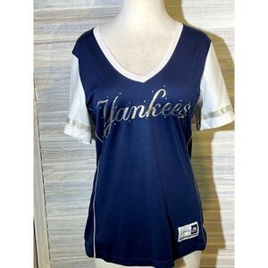 Classic jersey style top from Majestic. Size large. Rhinestones accents. Metallic varsity stripes. 100% polyester. Machine washable. Made in El Salvadore. Excellent condition. Nonsmoking home.