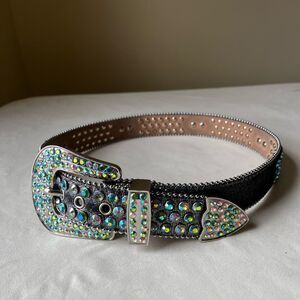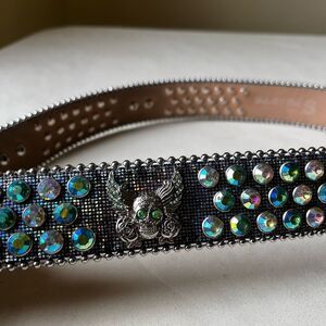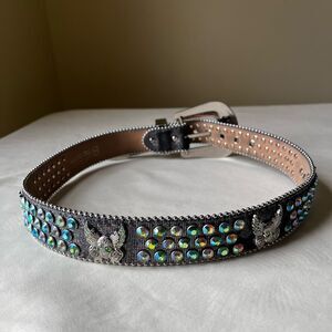 Studded rhinestone belt with winged skull design, blue crystal stones, and western buckle