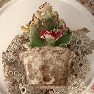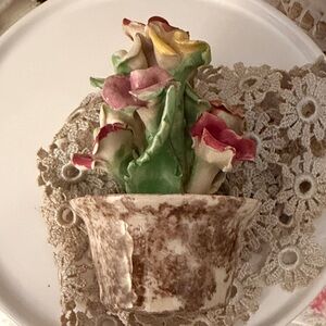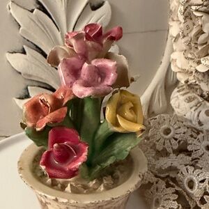 Vintage Hand-painted majolica rose flower pot. Features pink, red, yellow purple roses and green leaves. Vintage-inspired glazed finish. Sweet accent. 3 x 2 1/2 inches
