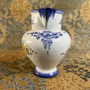 Bring a splash of Iberian charm to your shelf with this vintage Majolica pitcher, hand-painted with vibrant floral motifs and marked Porta 28, Portugal. Standing 8 1/8″ high, it features classic Mediterranean colors, a scalloped rim, and a graceful handle—perfect for display or serving sangria with flair.