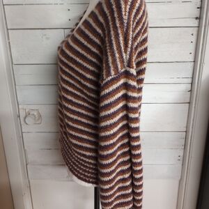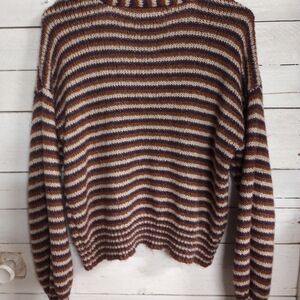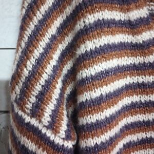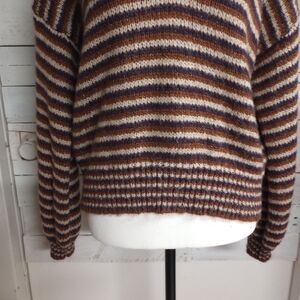 Major Label Group Women's Medium Knit Sweater Striped Cropped Bishop Sleeve Oversized, Brown and Purple. There is no fabric tag. Approximate measurements are laying flat armpit to armpit 25" and length from shoulder to hem 22". Condition is pre owned, used, good condition.