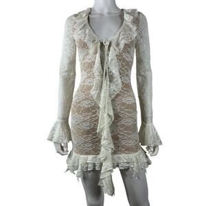 Majorelle 'Lucia' White Nylon Mini Dress Size S: partially lined, front tie closure, draped ruffle neckline and hem, lace fabric with flared cuffs.
