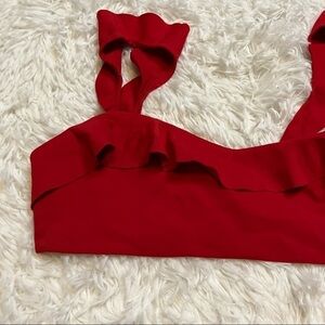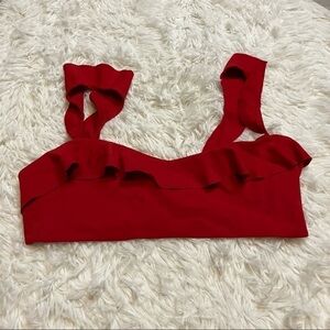 In excellent used condition no rips, tears or stains. A red colored crop top with a flounce ruffle fabric overlay, jersey knit fabric, non adjustable ruffle shoulder straps and back hook and eye closure.