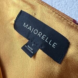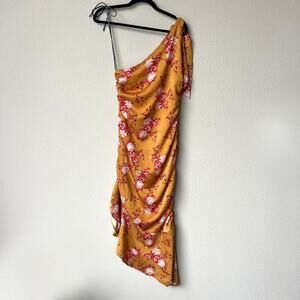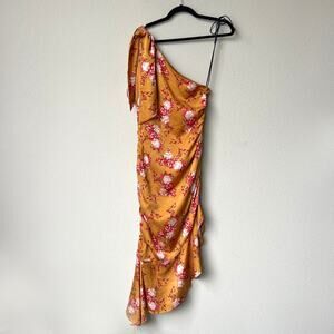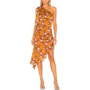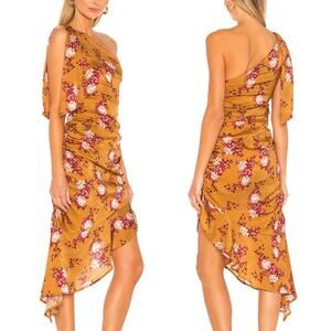 Majorelle 'Princeton' asymmetrical one shoulder gold floral midi dress in Countryside multi colorway. Adjustable shoulder tie detail. Asymmetrical ruffle hemline. Ruched sides. Woven polyester jacquard fabrication. In great condition. Size small - 16.5" pit to pit; 15" waist; 42" from pit to longest point on hemline.