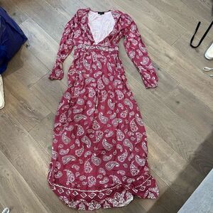 Majorelle Red Paisley Long Sleeve Gypset Boho Maxi Dress Size S Deep V Neck