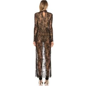 Absolutely stunning, hauntingly beautiful black lace beauty from Majorelle! A true showstopper with an "Old Hollywood" vibe, one of those timeless eye-catching pieces that guarantee you a sensational look on any occasion. It is made from gorgeous sheer lace with eyelash trim. It is designed with a sleek fitted silhouette, a plunge neckline, a chic choker, a high pant slit, long sleeves, an attached bodysuit lining with a bottom snap closure and a hidden back zipper closure. This piece is so striking that it will not require many accessories, and it features its own choker-like neckline. Made from high-quality material. (Self: 56% nylon 43% cotton. Lining: 95% poly, 5% elastane). Size XL. MSRP $228.00