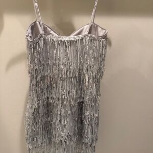 The MAJORELLE Samara Mini Dress in Silver is the modern twist on flapper girl glamour. With its adjustable shoulder straps and tiered draped sequin fabric, this dress is a sparkling sensation ready to light up any room. Perfect for New Year's Eve or any event where you want to channel 1920s elegance in a 2020s setting. Make a dazzling entrance and own the night.