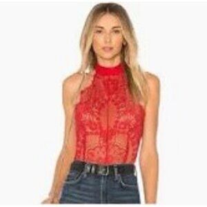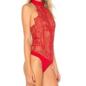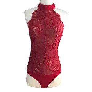 Majorelle Sarah Lace Bodysuit size M Red Thong Halter Stretch Backless Glamour