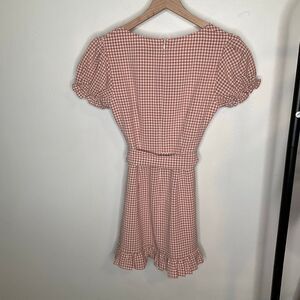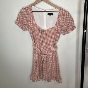 Neckline and waist tie detail. Elasticized sleeves. Hidden back zipper closure. Imported. Belted