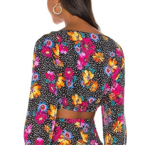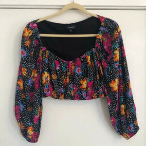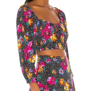 Majorelle Swift crop top in black multi floral and dot print. Sweetheart neckline with tie. Balloon sleeves. Machine wash. Excellent condition. Size M