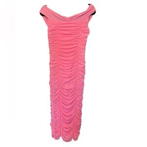 Revolve Majorelle Tabith Midi Dress in Bubblegum Pink Ruched Off the Shoulder Size M - Excellent Condition - Tulle - Shirred - Bodycon - Stretchy