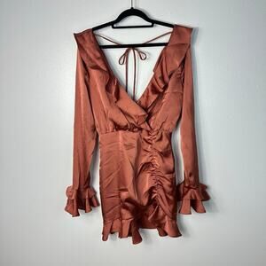Majorelle X Revolve Dress Nelly Ruffle Surplice Shirred Mini Terracotta Brown S