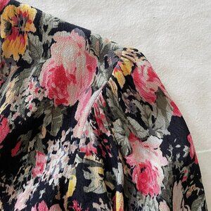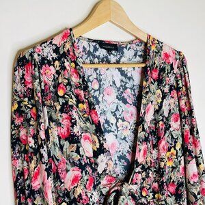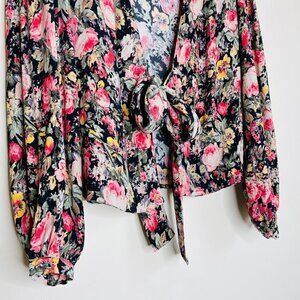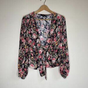 Adorable "Yara" blouse in a floral print called "Affair". Plunge / deep v neckline. Long sleeves with a cuff button. Tie closure at front allowing for the blouse to be worn with another top or peek-a-boo bralette underneath - or worn completely tied up for a different look. Lightweight fabric with no real stretch (but some give) and very light sheerness at the back only as the front bodice is fully lined. From Revolve.