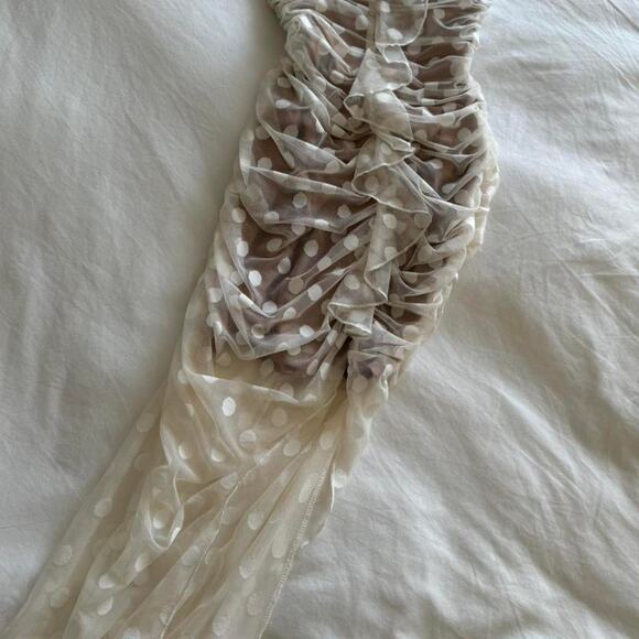 Majorelle cream and white polka dot mesh maxi dress with ruched detail
