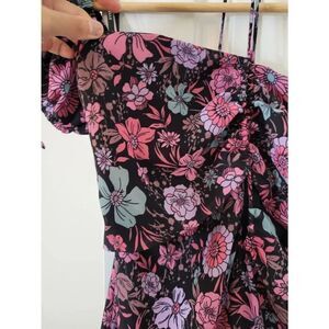 Hidden back zipper closure Front keyhole (cannot be tied tighter we there is stitching blocking) with crisscross halterneck straps with tie closure Off shoulder styling with elasticized cuffs and tie detail Georgette fabric with side slit welcome/bundle and save As seen on tv worn by Hannah on how I met your father Spring dress, summer dress, floral midi dress, floral dress