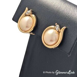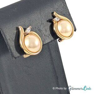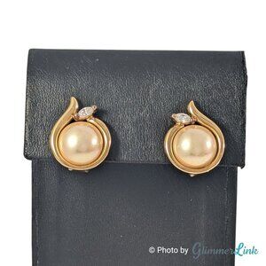 Majorica Creamy White Faux Pearl Clear Crystal 925 Gold Plated Omega Earrings