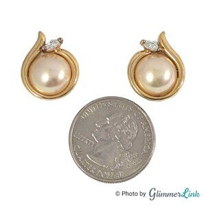 Majorica 925 sterling silver gold plated pierced earrings featuring a simulated creamy white faux pearl cabochon with a clear marquise cut crystal above it. The faux pearls display a subtle aurora borealis coating.