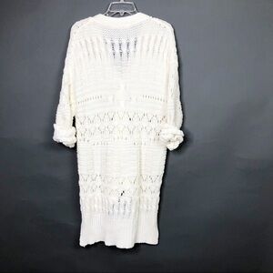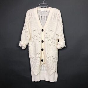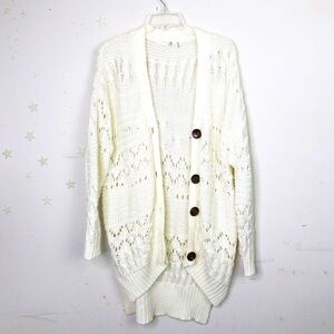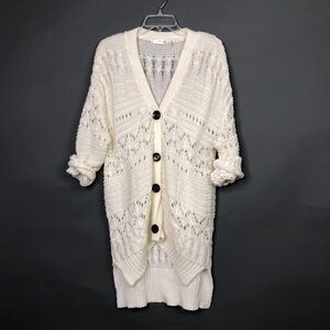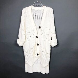 MAK by MAK B Cable knit cardigan, loose fit slouchy oversized 100% acrylic very soft with four big wooden buttons and splits at each side with high low hem.