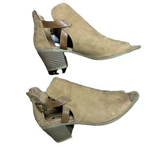 Super cute and comfy Makalu California peep toe booties in a versatile tan faux suede. Features a stacked heel, side cutouts, and ankle strap buckle. Size 7.5 – gently worn with minor wear on soles. Uppers in great condition.