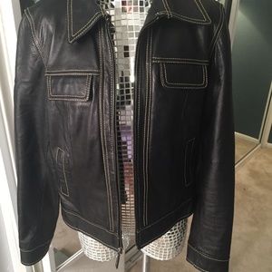 Kenneth Cole Reaction dark chocolate brown leather jacket with contrast stitching.