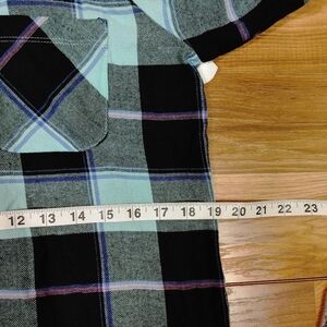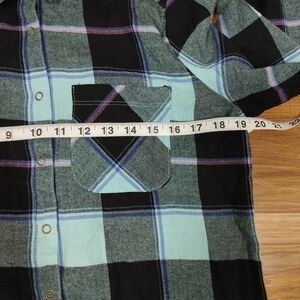 Make + Model Aqua Plaid Flannel Button Down Shirt Size XXS. aqua and black plaid. long sleeve. snap button front. cotton and polyester. measurements are approximate.