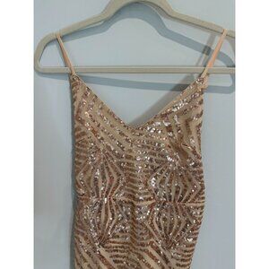 *This show-stopping cocktail dress features a triangle bodice and a figure-skimming mini silhouette, all composed of stretchy mesh fabric with an array of sparkling rose gold sequins. Two long chiffon straps tie at the back above the adjustable spaghetti straps. Hidden back zipper/clasp. Fully lined.