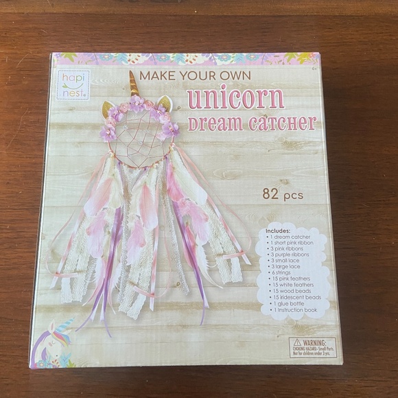 This unicorn dreamcatcher headpiece comes pre-assembled. Follow the instructions for knotting the ribbons and lace around the hoop. A smaller ribbon for hanging the dreamcatcher is also included. Decorate with feathers, beads, ribbons, and more. Kit includes 82 pieces. Seal has been opened but never used, plastic baggies inside have never been opened. So much fun for a creative unicorn lover!
