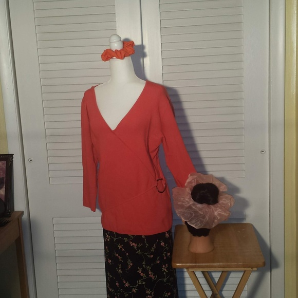 100 % Cotton in a bright mango at bottom right is a big metal circle It measures 17" across the front bust area, and is 28" long