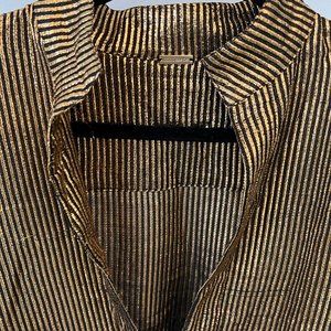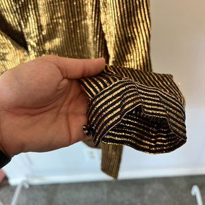 This is a fun night out at the club or night in Vegas shirt! Stunning metallic notes and low cut style. NOTE: Due to metallic material and high quality shirt, it needs to be professionally dry cleaned (as noted on the tag) there is some snagging from the metallic but nothing too noticeable. Adding more photos to display.
