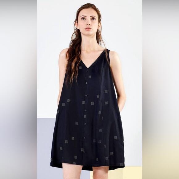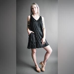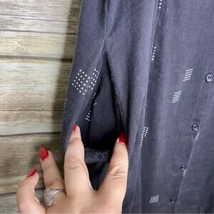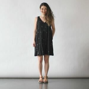 Make it Good S Portland Oregon linen blend V-neck button front dress black pattern. Dresses in great condition has pockets on the side. One extremely small hole on the back you really can’t see it when worn