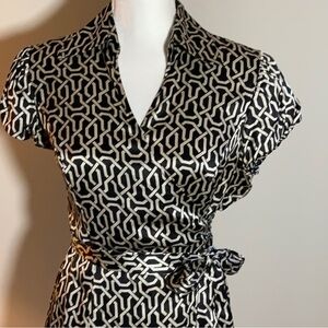 INC Designed this Chic wrap blouse featuring a geometric pattern from 100% silk. Short sleeves with a tie waist for a custom fit. Perfect for versatile styling - may be dressed up or down. Size 12 measures approximately 20.5 at chest pit to pit; 25" length from shoulder to hem.