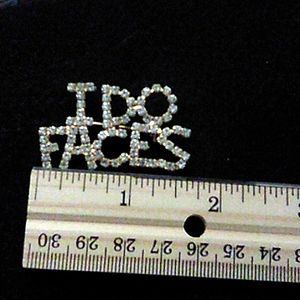 I DO FACES pin in clear stones. No stones are missing. About 1 and 3/4 wide.