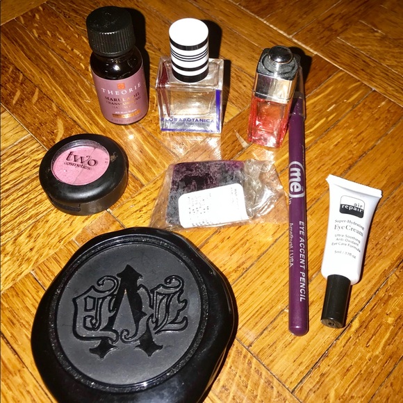 Small Florabotanica parfum, Small Dior Addict Parfum, Small Marula oil, ‘two’ duo eyeshadow in pinks , ‘Me’ eye accent Pencil in purple, Small air repair eye cream, Small ‘Lush’ in respect you elders,