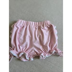Hearts and rose print on top, solid pink pants, and solid shorts/bloomers with ruffles on back.