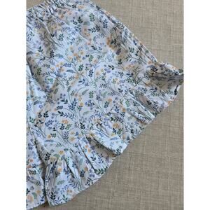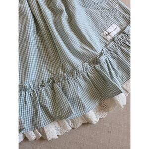 Green microcheck gingham with some yellow and blue on smocking. Shorts are white with green, yellow, and blue floral print.
