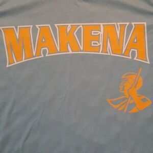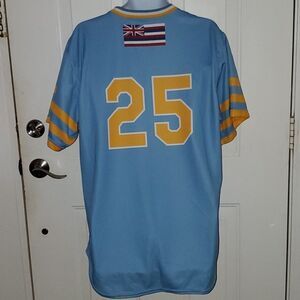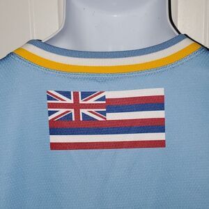 Pre-owned and in nice condition. No holes or tears. The front has an Ikaika warrior. The back is numbered and Hawaiian flag. It's a size 48 which is XL. The length is about 32" long. The color is a lighter shade of blue.