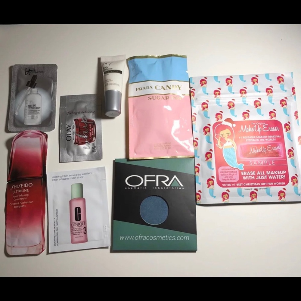 This lot includes samples/deluxe samples/full size products. This includes an Ofra eyeshadow single in the shade Blue Jeans, a Prada Candy Sugar Pop perfume sample, a N7 Serum, a Make Up Eraser sample, and foil packets. The foil packets contain an Olay Regenerist Whip, a Clinique Clarifying Lotion, an It Cosmetics serum, and an Shiseido Ultimune power infusing concentrate. Thanks for viewing!