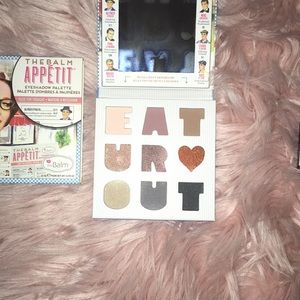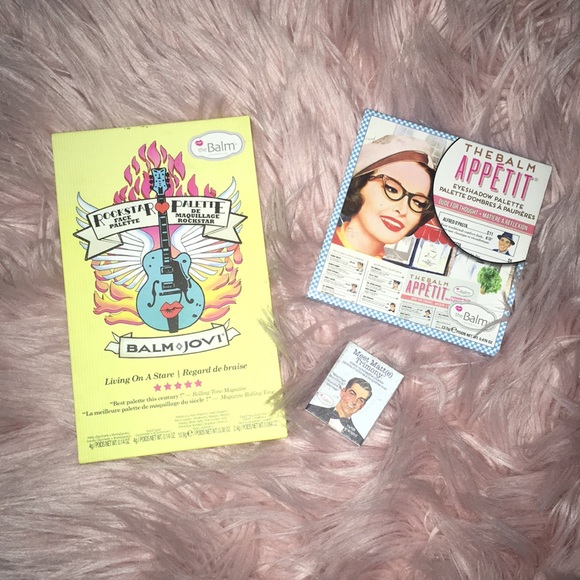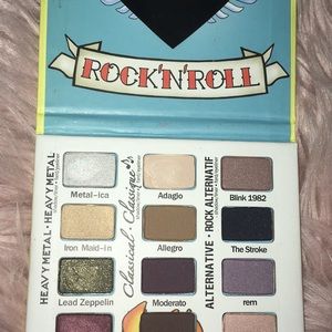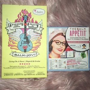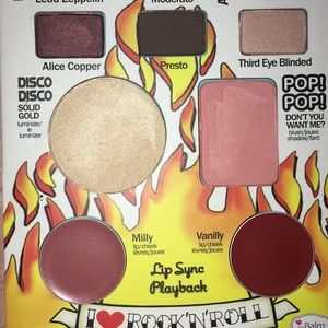 Makeup palettes. The palette with the lady has never been used. The guitar palette has been used one time, just 4 of the eyeshadows and the 2 blushes as shown in picture. And the tiny eyeshadow has never been used just has a small fingerprint mark cuz I wanted to see how the color looked on the skin. Can sell separate or altogether.