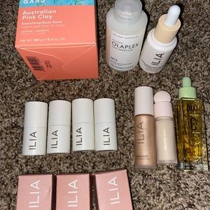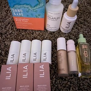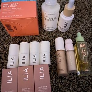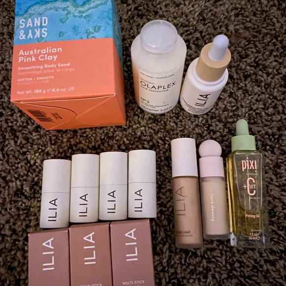 All this together. I have 7 ilia multi sticks 3 still in boxes the punters not. I used one time the rest I didn’t use at all. The one I used 1 time was the one all of me out of the multi sticks. I also have the ilia liquid highlighter the nova one. I have the rare beauty concealer I tried one time and didn’t like it. It’s color 110N. I have the pixi priming oil. The ilia skin tint. I have the olaplex hair perfector. And the last thing is the sand and sky Australian pink clay body scrub never used. So 13 items all regular sizes not mini.