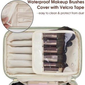 🧿Separate Brushes Compartment: The top flap includes 6 slots with clear make up brush cover with velcro tape for storing more than 10 different size of brushes while traveling. And the clear cover is easy to clean & protect brushes from dust.