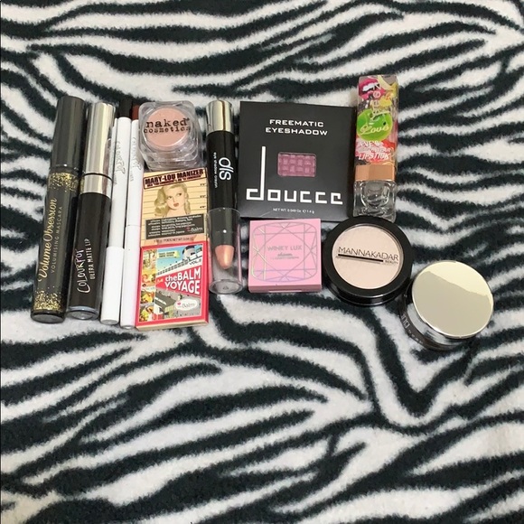 Never used makeup! Excellent condition. Items include: Colourpop cosmetics liquid lipstick and lip liners, mascara, Naked cosmetics, the Balm cosmetics, eyeshadow, highlighter, lipstick, perfecting powder, and brown gel eyeliner