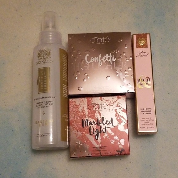 Too Faced Pretty Penny$(21),Ciaté London Confetti Highlighter($32),Ciaté London Marble Light Blusher($26) SKIN&CO - TRUFFLE THERAPY RADIANT DEW MIST($35). Never used or swatched. Only opened to take pictures.